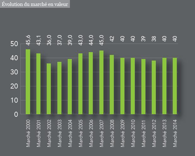 Le marché 2014 des logiciels pour bibliothèque stagne à 40 millions d’euros alors que le volume des ventes marque une forte baisse, en recul de 21 % avec 1125 ventes de produits déclarées pour 2014 contre 1424 en 2013. Sur la cinquantaine de fournisseurs recensés, treize réalisent un chiffre d’affaires de plus d’un million d’euros.