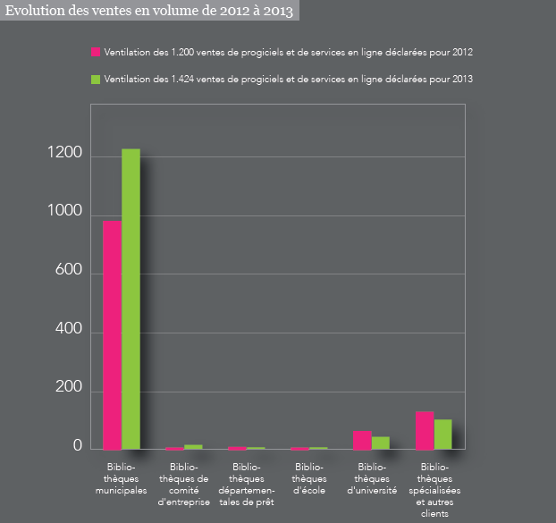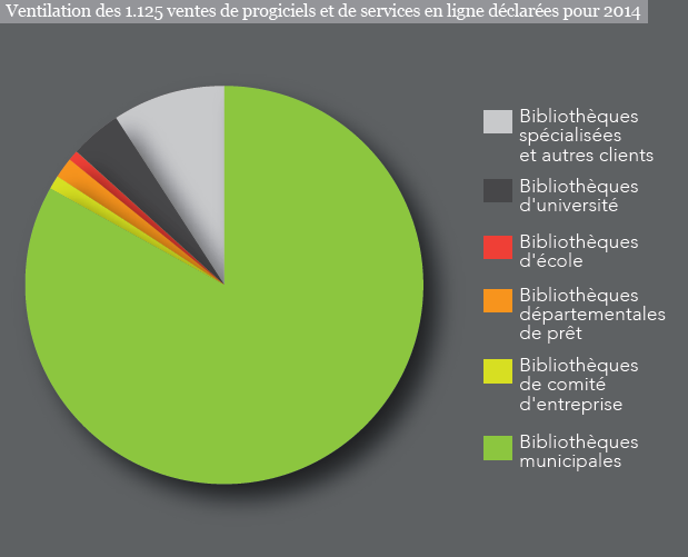 L’année 2014 n’est pas une bonne année pour les ventes de progiciels et de services en ligne aux bibliothèques, les trois principaux secteurs de clientèle - bibliothèques municipales, bibliothèques spécialisées et bibliothèques d’université - ont connu une forte baisse des ventes en volume. Les élections municipales de mars 2014, les contraintes budgétaires pesant sur les collectivités comme sur les universités expliquent en grande partie ce fort recul des ventes.