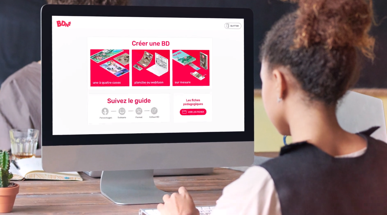 Baptisée BDnF, cette application (bureau et mobile) est disponible gratuitement et permet de créer des bandes dessinées mais aussi des romans graphiques ou tout autre récit mêlant illustration et texte. Son objectif est d'aider les internautes à s'approprier les notions fondamentales de la BD : construction du récit, codes de la bande dessinée, composition d'une case...