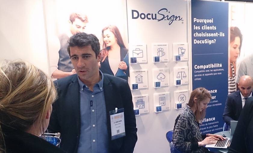Michael Lakhal, Product Marketing Manager de DocuSign, en pleine explication sur le stand de la société, juste après sa conférence sur la signature électronique